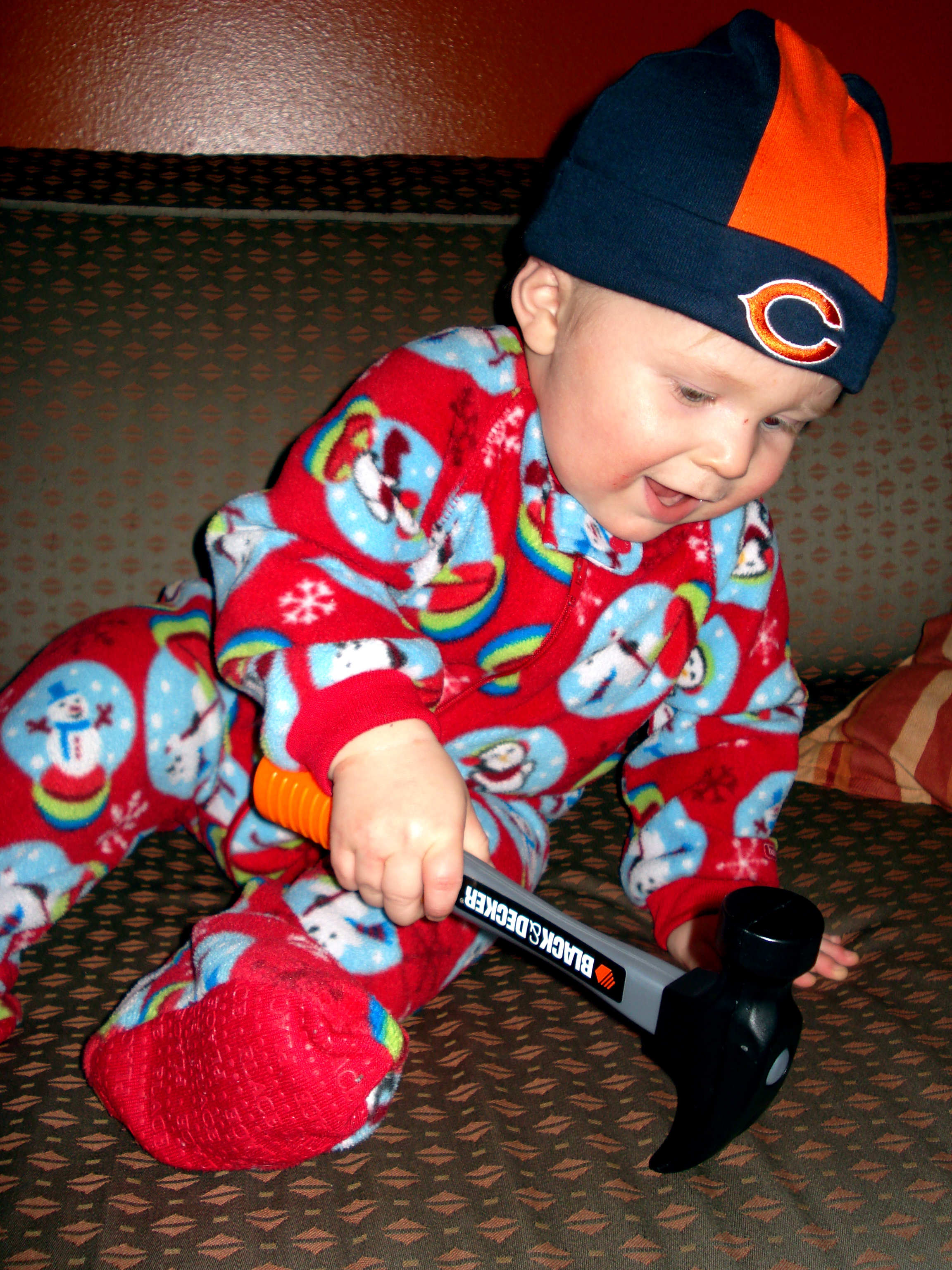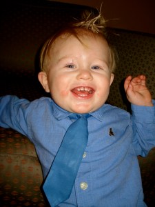 Link – 13 months old and so much fun!  He almost always has a smile on his cute little face and he LOVES to laugh. He is soooo determined and not much will sway him if he’s got his mind set on something.  He’ll go over, under, but mostly just right through something to get at whatever he wants.  That’s why he’s earned the nickname “little tank”….also a reason why his birthday party had a camo theme which is when we took the family picture on our blog. Lincoln will even go so far as to come up with pretty ingenious ways of distracting us just so he can get at what he wants.  And what does he do when he is caught being naughty?He smiles real cute, trying to get away with it.  Lately, when he’s gotten in trouble he will close his eyes and put this sad look on his face and fake cry to try to show some remorse, then he will peek at us to see if we are watching.  Yep, he’s a stinker!  But such a cute stinker that it’s hard not to laugh sometimes.  He started walking about a month before his birthday and now walks exclusively.  I love this stage.  It’s just so funny seeing such a little person toddling around!  He’s really trying to run now…mostly to keep up with his big sister.  He wants to do everything she does and learns things early because he’s watching her so closely.  He learned how to get his teeth brushed because of watching Ava and gets so excited about it when it’s his turn.  He’s also learning how to fold his hands when we pray, which is super adorable. He’s trying to say some words.  So far, beyond momma and dada, he says “hi” and “fishy”.  He is all about making noise though…just a typical boy!  We love it!  He still gives amazing hugs…when you can catch him that is and he gives open mouth, slobbery kisses.  Love that too!  His favorite toy right now is the tool-box Josiah bought him for Christmas.  The hammer is his favorite and he carries it around everywhere and very intently “fixes” everything. He somehow just knows how to use the rest of the tools too…isn’t it amazing how God just ingrains these things in our kids.  I love to see the differences in my boy and my girl.  Wow, are they different!  I have given Lincoln 4 haircuts already, and his hair still does what it wants.  I wouldn’t want it any other way…it suits him. Getting him dressed is like a wrestling match…we are working on patience in that area.  He knows the sign for “all done” which I use when I’m done changing his diaper or dressing him.  He also waves bye-bye and is very proud of that.  We are working on animal sounds, but he’s not too interested in that yet.  He loves trucks and he loves stacking blocks.  He knows what noise an airplane makes and flys his fighter jet all around the house.  He is very busy and loves to climb on things and even though he knows how to get back down, sometimes he gets this look on his face and you know he’s going to just step off.  He tries so hard to be funny and make people laugh.  He does not like to be left out of anything and lets you know about it.  He loves food and is definitely not a picky eater.  He has started to be a moocher like his sister, which can be tricky with all his allergies.  After learning about his food allergies (milk, eggs, and peanuts), and changing his diet because of that, his skin has cleared up a lot and he has become a really good sleeper.  YAY!  Neither of my kids have slept through the night until they were after a year old….not fun, but it makes me appreciate it even more when they start 🙂