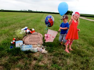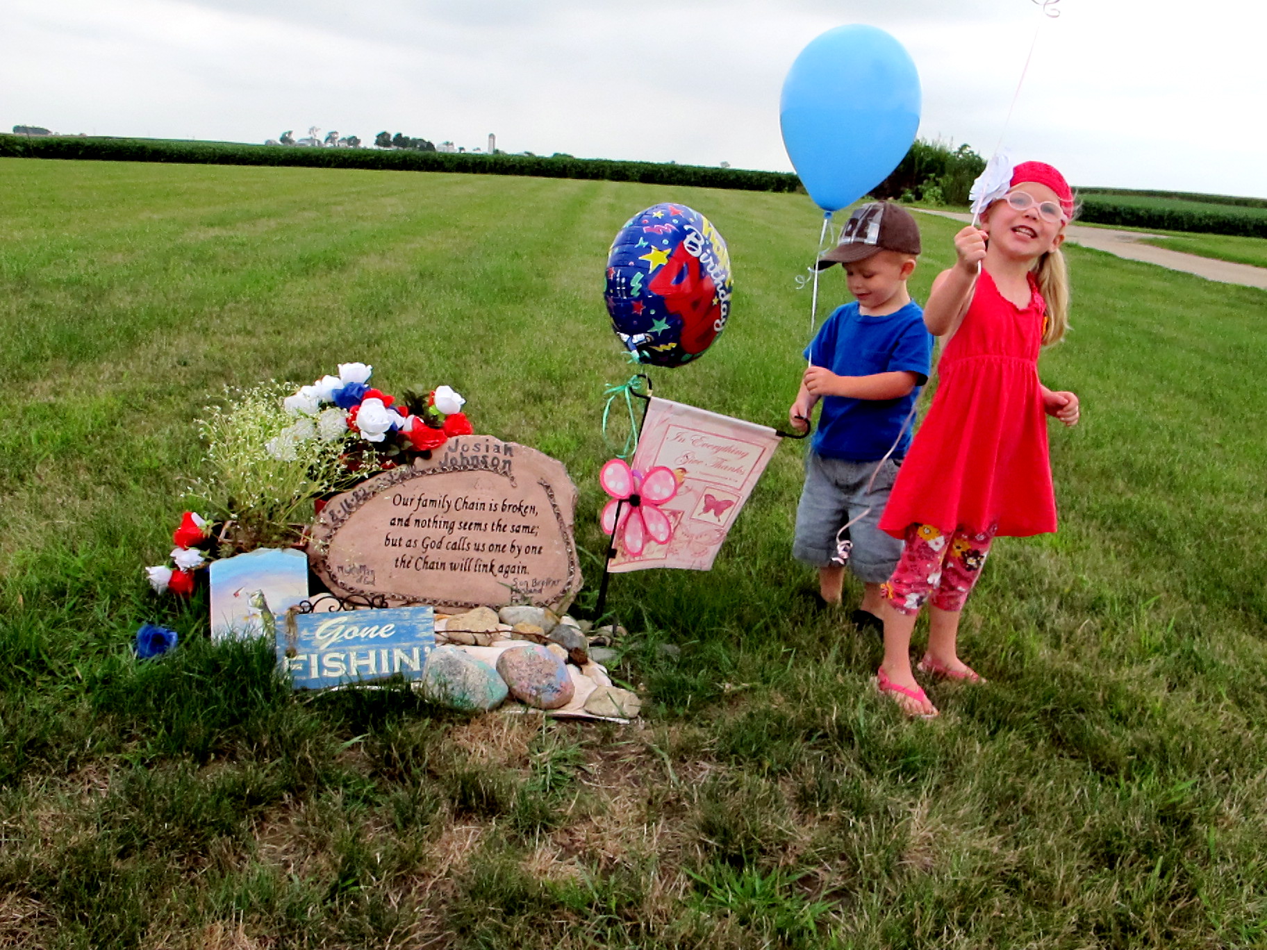 Naptime when we got home. Not sure who was the most worn out. After the kids woke up, we bought some balloons and headed for the cemetery. Ava’s been talking for a whole year about how we let balloons go at Daddy’s grave, so I think it’s now a tradition. They each got to pick out their color of balloon…pink and blue, very typical. When I asked Ava what color I should get she said, “Ummm…yellow. Because it’s the color of a smiley face”. I love her!